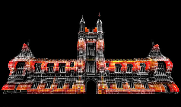 The piece unfolds in a conceptual triptych narrative about the human quest for, and ultimate separation from, materialistic obsession. Silhouetted individuals find themselves challenged by realms of illusion and truth. These realms are represented by the transforming features of the University building's iconic, towering facade.